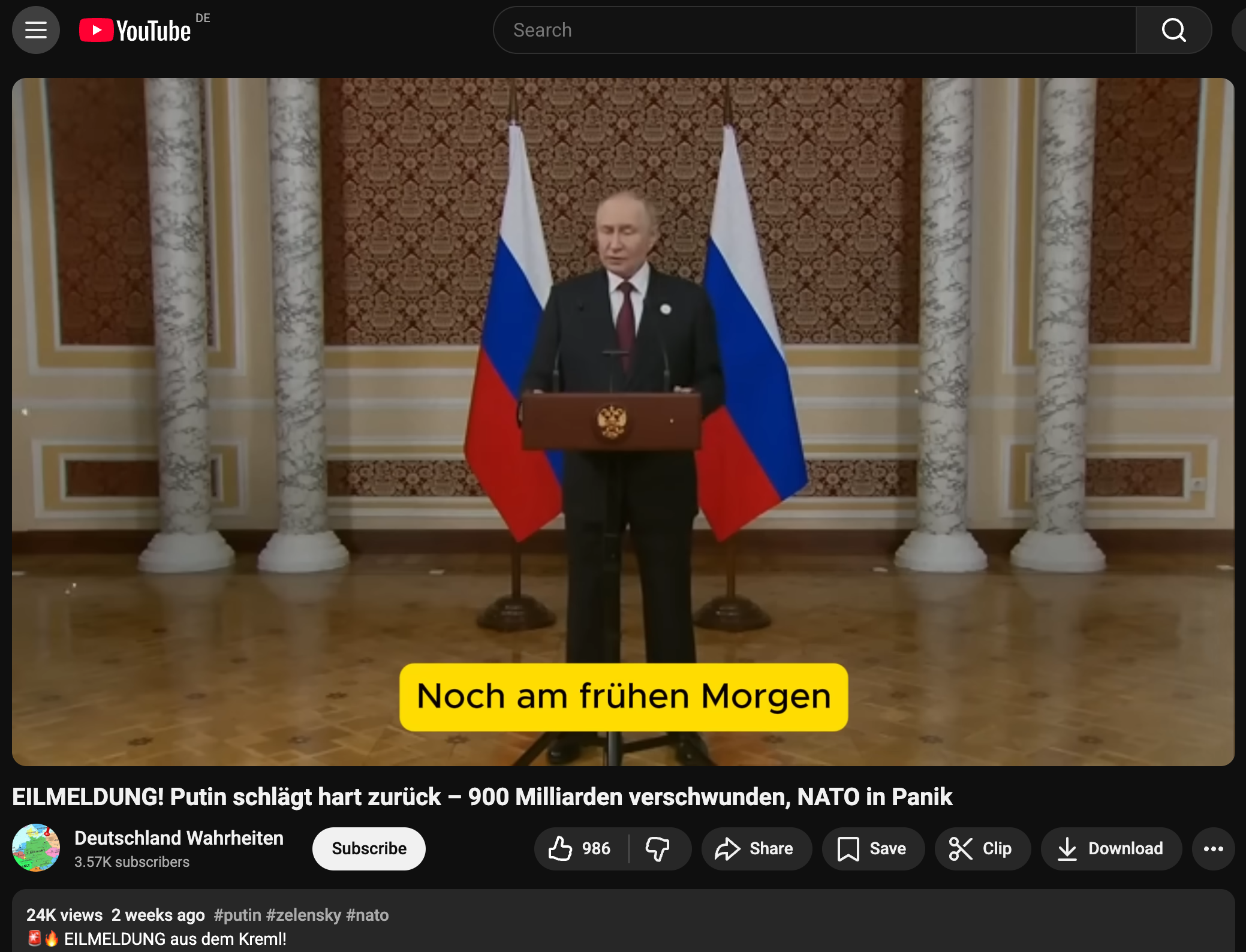 Ein Youtube-Video verkündete eine vermeintliche „Eilmeldung aus dem Kreml“. Der russische Präsident, Wladimir Putin, habe mit einem Sonderdekret angeordnet, dass sämtliche Vermögenswerte der Nato sowie alle mit ihr verbundenen Unternehmen auf russischem Territorium beschlagnahmt werden. Der geschätzte Wert dieses Vermögens seien 900 Milliarden US-Dollar. Weiter heißt es, dass Russland eine 1000 Seiten lange Liste veröffentlicht habe, die alle betroffenen Unternehmen nenne – darunter etwa die deutschen Autokonzerne Volkswagen und Mercedes-Benz oder die österreichische Raiffeisenbank (Österreich ist kein Nato-Mitglied) oder der Ölkonzern BP. Diese Behauptung verbreitet etwa ein Kanal mit dem Namen „Deutschland Wahrheiten“, dessen Video rund 25.000 Aufrufe erhielt. Wir fanden auf Youtube mehr als zehn weitere Kanäle, die ähnliche Videos veröffentlichen, die im Kern dieselbe Behauptung enthalten.