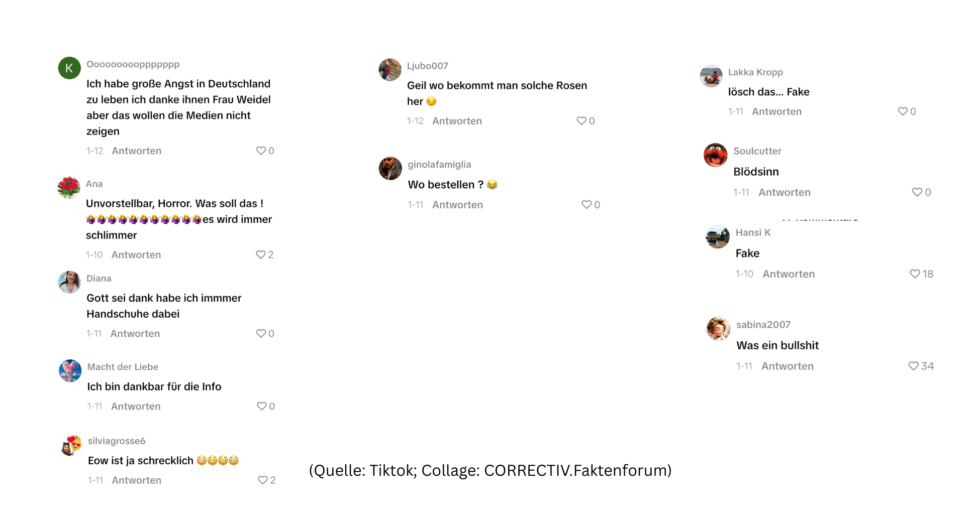 Mehrere Videos in Sozialen Netzwerken warnen vor einer angeblichen neuen Überfallmasche. Sie behaupten, Kriminelle würden Rosen, die mit Gift besprüht seien, an Autotüren befestigen. Frauen, die die Rosen berühren, sollen danach Schwindel, Orientierungslosigkeit und Kontrollverlust bis hin zu Gedächtnislücken erleiden. Die Videos werden als „Eilmeldung“ angepriesen und warnen: „Eine einzelne Rose im Auto könnte der Anfang eines Verbrechens sein.“ Die Clips bestehen aus kurzen, zusammengeschnittenen Sequenzen. Die meisten Videos nutzen denselben Wortlaut und am Anfang Sequenzen von Alice Weidel, die in die Kamera spricht. Danach folgen Aufnahmen von Rosen, die an Türgriffen oder unter Scheibenwischern befestigt sind. Über die Bilder ist die Stimme einer Sprecherin gelegt, die die angebliche Masche schildert und vor den Rosen warnt. Weitere Szenen zeigen etwa einen Kofferraum voller roter Rosen und eine Frau, die offenbar mit Schwindel am Boden liegt. Zusammengenommen haben zwei der viralsten Videos fast eine Million Aufrufe auf Tiktok. Die Kommentare unter dem Video fallen unterschiedlich aus. Einige Nutzerinnen und Nutzer reagieren besorgt und schreiben etwas „Unvorstellbar“, „Horror“ oder „Was soll das, es wird immer schlimmer“. Andere kommentieren zynisch, etwa „Geil, wo bekommt man solche Rosen her?“ Wieder andere zweifeln an der Meldung und nennen sie „Fake“ oder „Bullshit“.