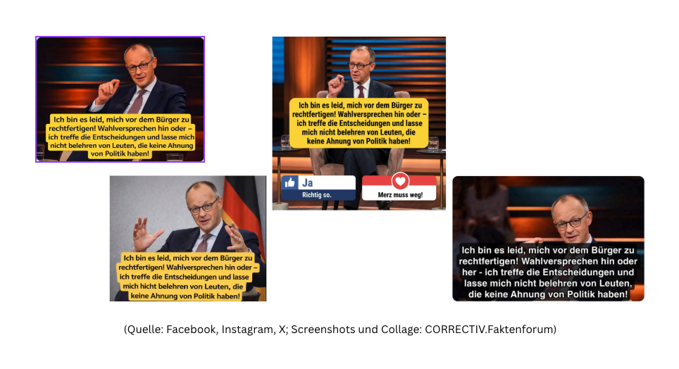 Mehrere Beiträge in Sozialen Netzwerken zeigen ein Foto von Friedrich Merz, überlagert mit einem angeblichen Zitat: „Ich bin es leid, mich vor dem Bürger zu rechtfertigen. Wahlversprechen hin oder her – ich treffe die Entscheidungen und lasse mich nicht belehren von Leuten, die keine Ahnung von Politik haben.“ Der Wortlaut bleibt in den verbreiteten Versionen gleich, das Bild ist teilweise ein anderes. Eine konkrete Quelle wie eine Rede oder ein Interview nennen die Beiträge nicht.