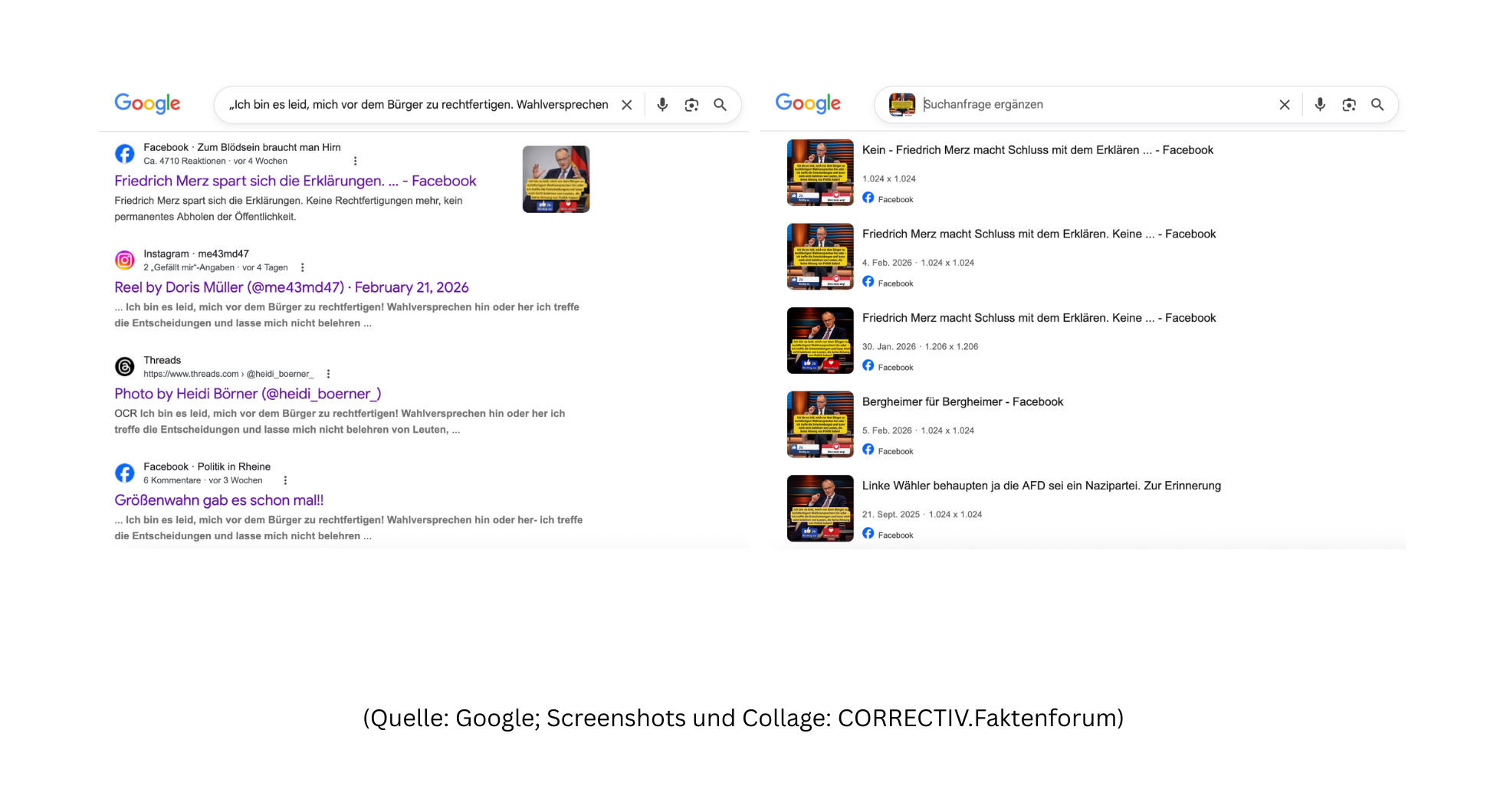 Die Suche nach dem vollständigen Zitat oder markanten Textteilen führt ausschließlich zu weiteren Beiträgen in Sozialen Netzwerken, genauso wie eine Bilder-Rückwärtssuche. Sie lieferte teilweise irreführende Treffer, da Suchmaschinen visuell ähnliche Motive oder thematisch verwandte Beiträge anzeigen können, selbst wenn das konkret gesuchte Bild dort nicht enthalten ist. Beim manuellen Prüfen der einzelnen Ergebnisse zeigte sich, dass mehrere Posts das verbreitete Bild mit dem angeblichen Zitat tatsächlich nicht enthielten. Der älteste Beitrag stammt vom 28. Januar 2026 auf Facebook.