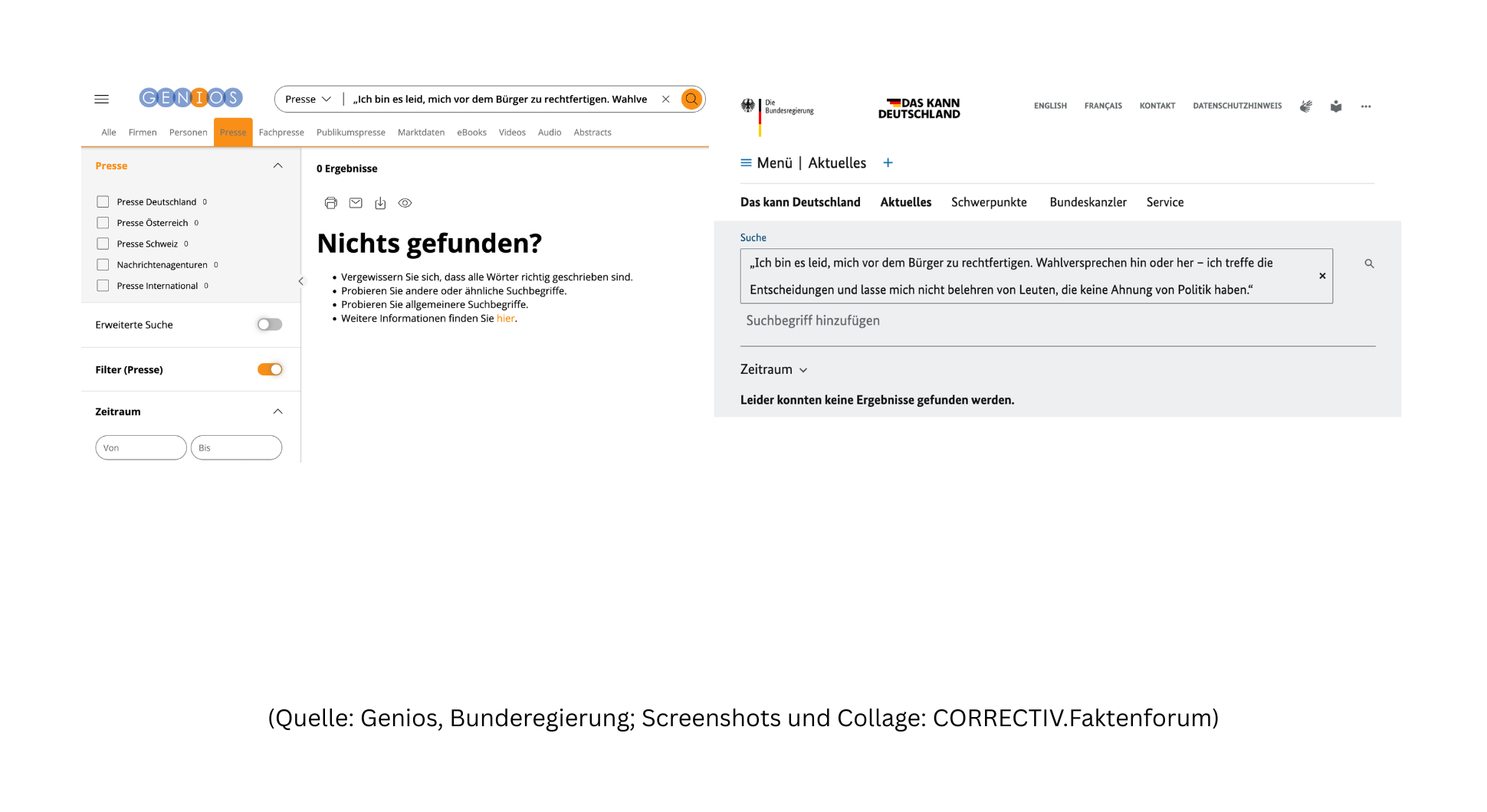 Eine Recherche in der Pressedatenbank Genios liefert keine Treffer zu den zentralen Formulierungen des angeblichen Zitats in Verbindung mit Friedrich Merz. Auch in öffentlich zugänglichen Parlamentsdokumenten und Redetexten taucht der Wortlaut nicht auf. Auf Anfrage schrieb uns eine Regierungssprecherin: „Die vermeintliche Aussage des Bundeskanzlers ist frei erfunden und entbehrt jeder Grundlage.“