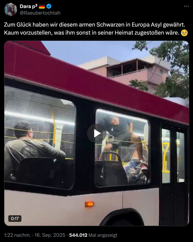 Hinweis: In diesem Beitrag werden Aufnahmen gezeigt und verlinkt, die Gewalt zeigen. In Sozialen Netzwerken kursiert ein Video, das Gewalt in einem Bus zeigt. Darin schlägt ein schwarzer Mann mehrfach auf einen weißen Mann ein. In einem viralen X-Beitrag heißt es dazu: „Zum Glück haben wir diesem armen Schwarzen in Europa Asyl gewährt. Kaum vorzustellen, was ihm sonst in seiner Heimat zugestoßen wäre.“ In einer längeren Version des Videos ist zu sehen, wie der Busfahrer den weißen Passanten aus dem Bus führt.