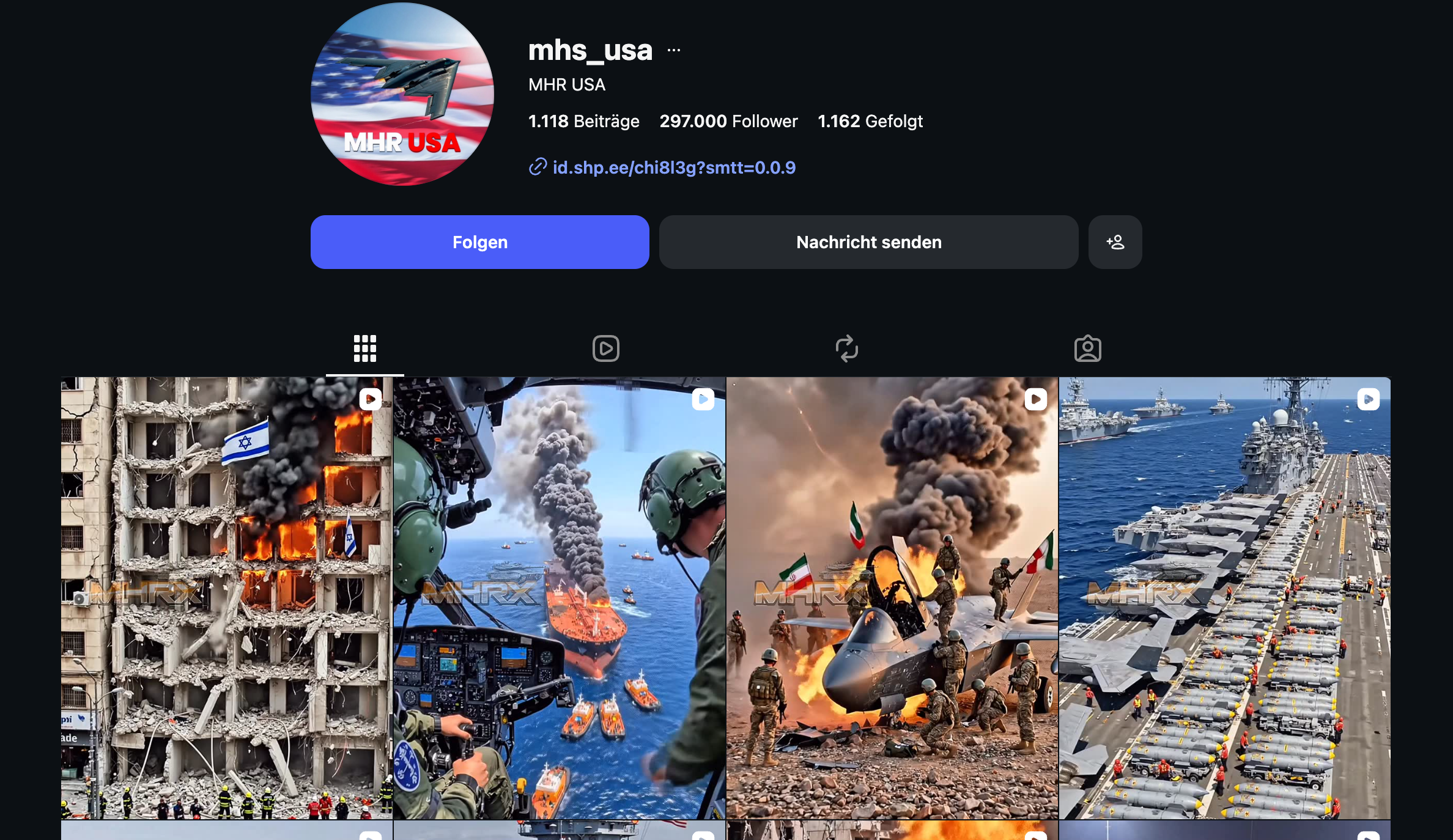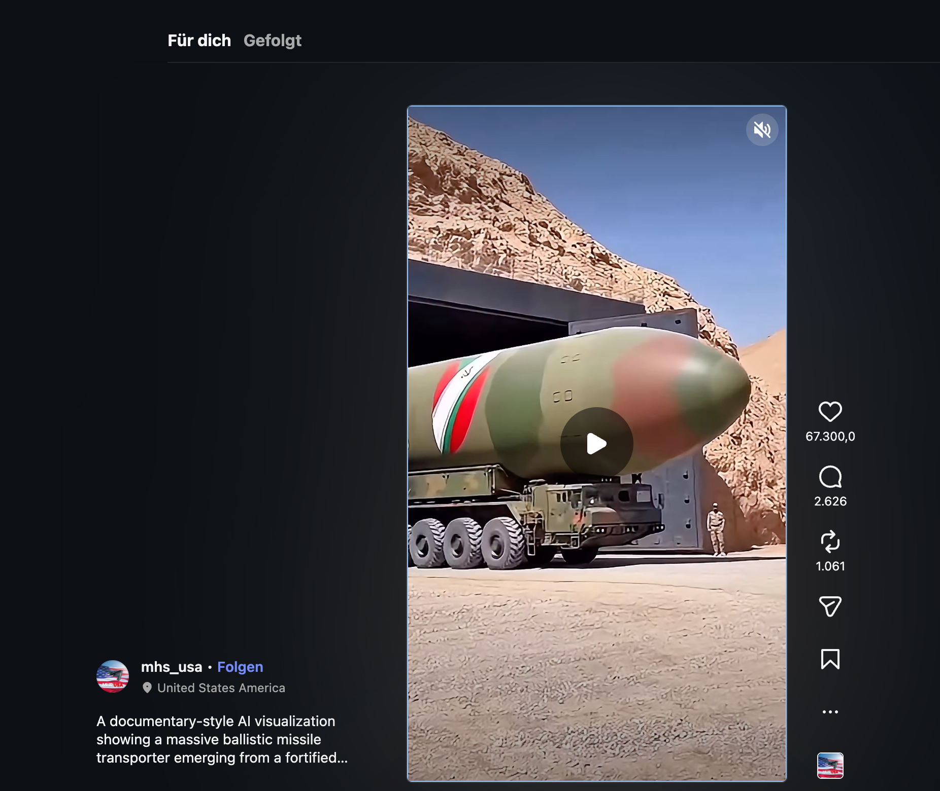 Eine Bilder-Rückwärtssuche führt neben den hunderten Dubletten auch zu dem Instagram-Kanal „mhs_usa“, der das Video schon am 31. Januar veröffentlichte. Das war das früheste Datum, an dem wir das Video finden konnten. In der Beschreibung wird die Szene klar als KI-generiert gekennzeichnet: „Eine im Dokumentarstil gestaltete KI-Visualisierung, die einen riesigen Transporter für ballistische Raketen zeigt, der aus einem befestigten Bergtunnel herausfährt.“ Das Video hat dort 4,4 Millionen Aufrufe. Der Kanal veröffentlicht immer wieder KI-generierte Militärvideos, mehrfach auch solche, auf denen LKW-Transporter mit Raketen aus einem Bergtunnel fahren. Andere Videos zeigen weniger realistische Szenen, etwa ein Elefant in einem Flugzeugträger oder ein Hai mit einer Kamera. Wir wollten von dem Kanalbetreiber wissen, warum die Raketen in den Bergtunnel-Videos aufgemalte Flaggen haben, die an die iranische erinnern. Dazu bekamen wir vor Veröffentlichung keine Antwort.