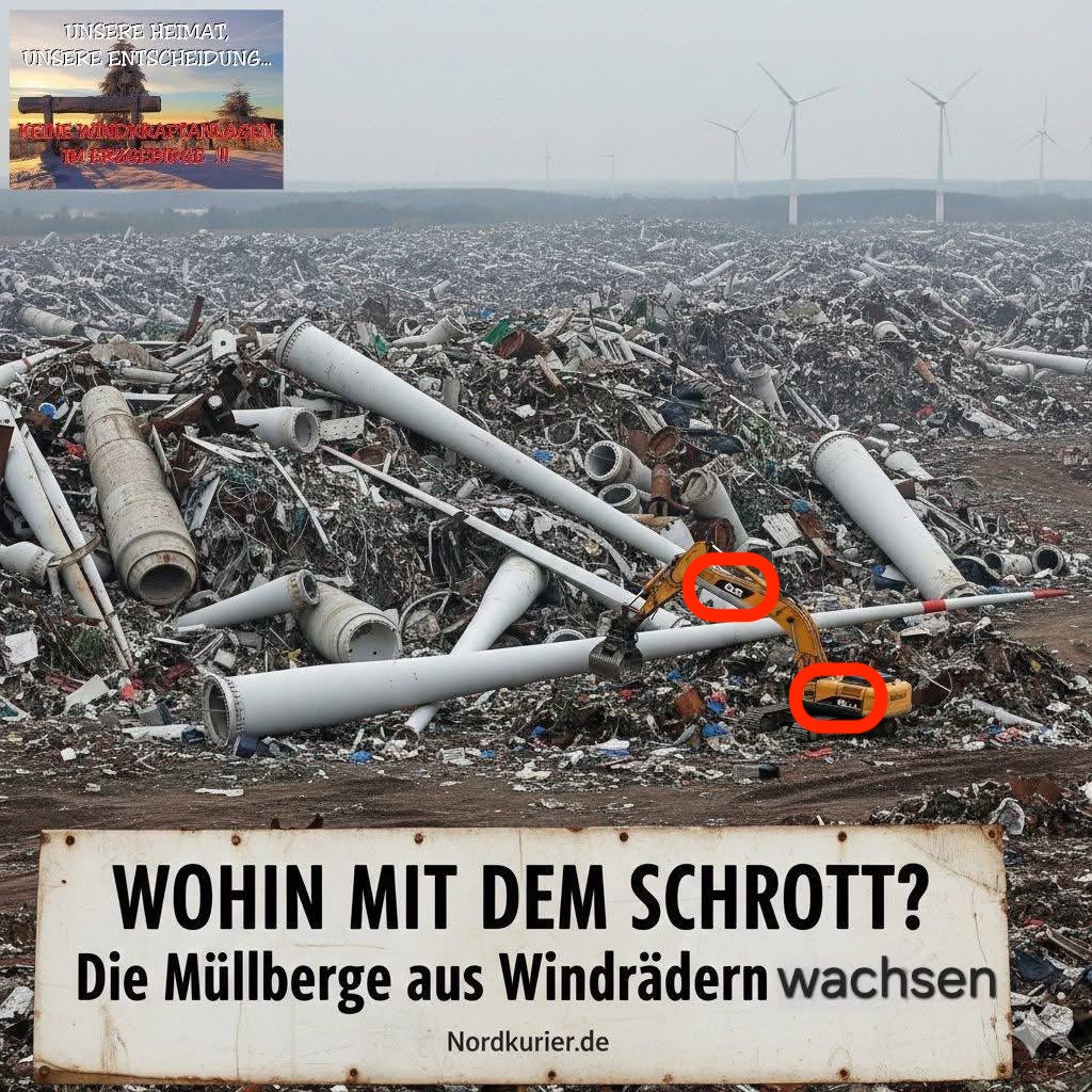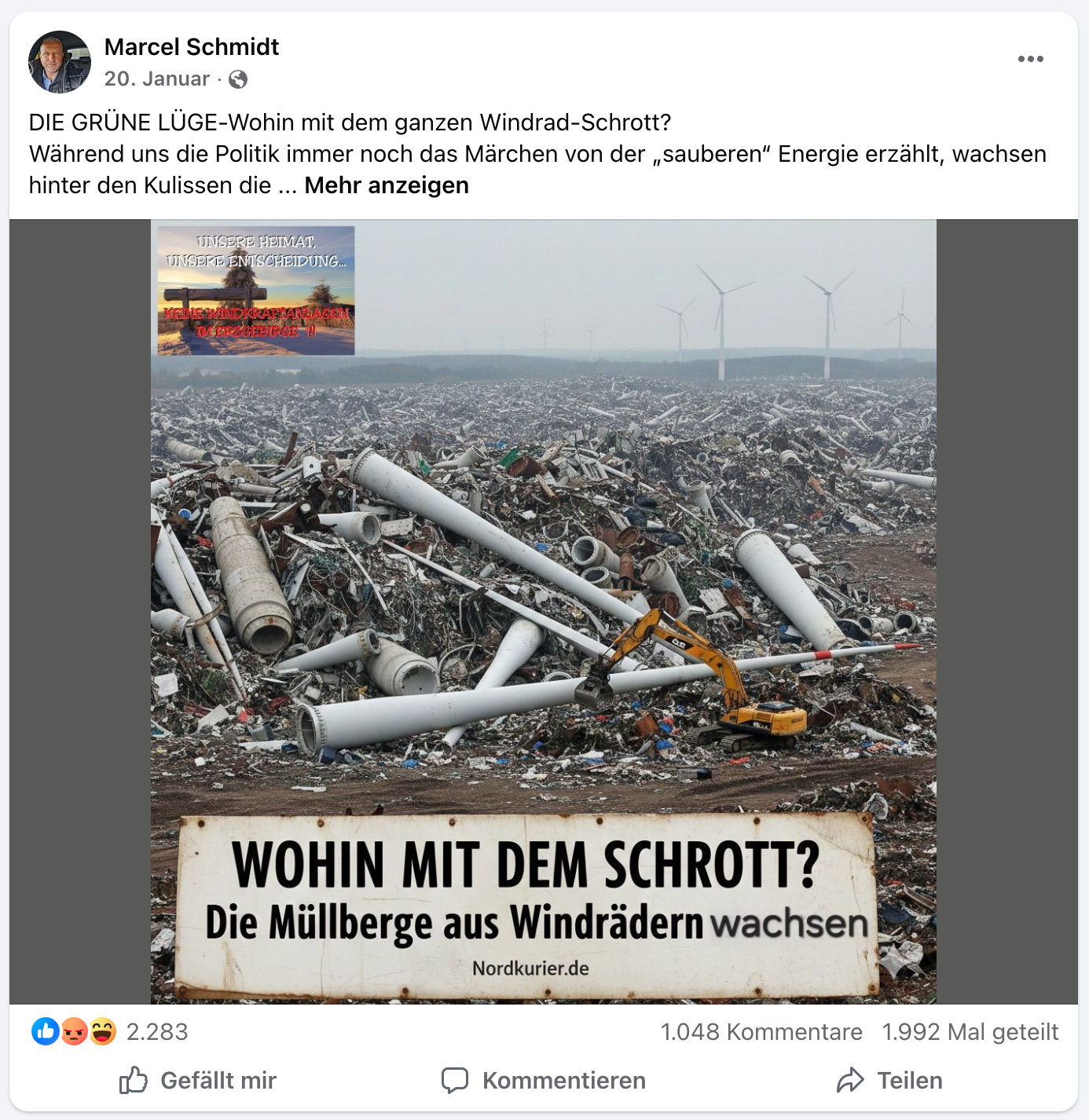 Unten im Bild wird auf die Seite Nordkurier.de verwiesen. Der Nordkurier ist eine regionale Tageszeitung, die in Teilen von Mecklenburg-Vorpommern und Brandenburg erscheint. Das Bild fanden wir auf der Seite der Zeitung nicht, weder mit einer Bilder-Rückwärtssuche noch mit gezielten Stichwortsuchen. Wir fanden jedoch einen Artikel, dessen Überschrift dem Text im KI-Bild ähnelt: „Die Müllberge aus Windrädern werden immer größer: Doch wohin mit dem Schrott?“ Der Artikel berichtet über die Antwort der Bundesregierung vom 2. Januar auf eine Kleine Anfrage der AfD zur Entsorgung von Windrädern. Die Bundesregierung verweist darin auf eine Studie des Umweltbundesamts (UBA), nach der bis 2040 etwa 403.000 bis 642.000 Tonnen schwer zu recycelnde Abfälle aus Rotorblättern anfallen würden. Mehr dazu siehe Fakt 5.
