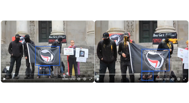 Das Video hat zahlreiche Auffälligkeiten, die darauf hindeuten, dass es mithilfe von Künstlicher Intelligenz erstellt wurde. So verschwinden die gelben Farbbeutel teilweise in der Luft. Auf dem Boden sind keine Farbspritzer zu sehen. Auch innerhalb der Personengruppe verändern sich Details unnatürlich: Das Gesicht der Person mit den Protestschildern wechselt zwischen den Bildfrequenzen deutlich in Form und Proportion, die Schriftzüge auf dem Banner und den Plakaten verändern sich mehrfach, und bei der sitzenden Person im Hintergrund taucht plötzlich ein Gegenstand in den Händen auf, der zuvor nicht da war. Solche Unstimmigkeiten sind typisch für KI-generierte Videos, bei denen aus einem einzelnen Foto künstliche Bewegung erzeugt wird. Sie zeigen klar: Die Szene ist nicht real gefilmt, sondern digital erzeugt.