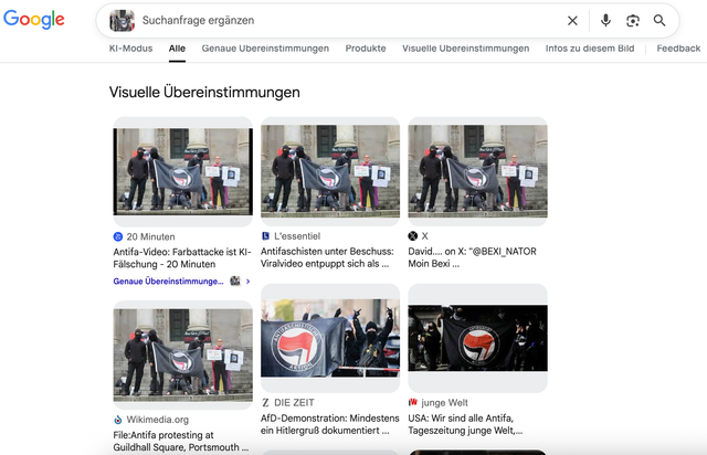 Das Faktenforum hat mit Standbildern aus dem Video per Bilderrückwärtssuche nach dem Ursprung gesucht. Die Suche führt zu einer Fotoserie des Fotografen Tim Sheerman-Chase: Sie zeigt dieselbe Personengruppe am 7. September 2024 auf der Treppe am Guildhall Square in Portsmouth, Großbritannien. Dort finden sich aber keine Hinweise, dass jemand Farbe auf die Demonstranten geworfen hat. Ein Vergleich des Gebäudes im Video mit der Portsmouth Guildhall auf Google Street View bestätigt die Ortsangabe. Die Aufnahme entstand im Rahmen einer Demonstration gegen Rassismus. Lokale Medien berichten über den Protest mit rund 350 Teilnehmenden als friedlich. Die Lokalzeitung „The News“ schreibt, dass es keine Probleme oder Festnahmen gegeben habe. Die Antifa-Gruppe hatte demnach rund 15 Mitglieder. Hinweise auf einen Angriff mit Farbbeuteln gibt es nicht.