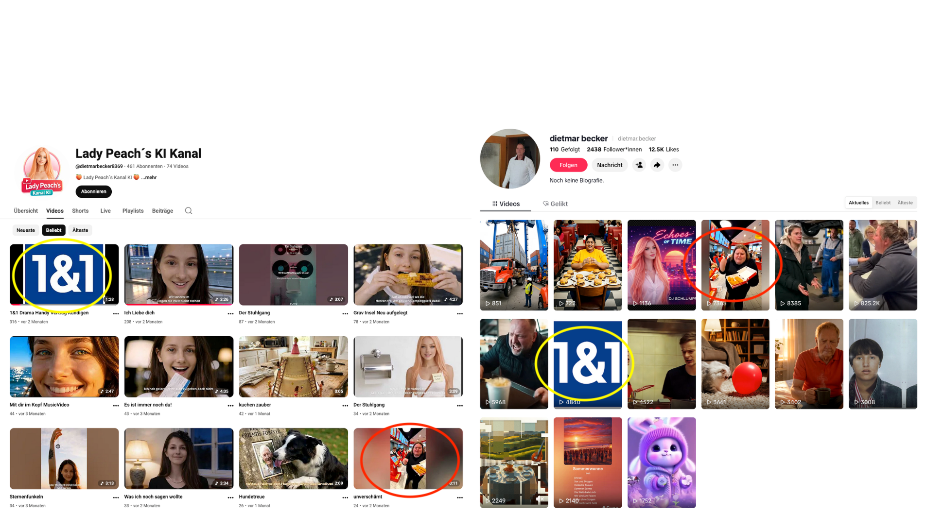 Die Accounts „Lady Peach´s KI Kanal“ auf Youtube und „dietmar.becker“ auf Tiktok, die das Video zuerst veröffentlicht hatten, scheinen zusammen zu gehören. Der Tiktok-Kanal lädt mehrfach die gleichen Videos wie der Youtube-Kanal auf der Plattform hoch, bis auf das Arbeitsamt-Video mit größerer Reichweite. Außerdem lautet der Nutzername des Youtube-Kanals „Lady Peach´s KI Kanal“ @dietmarbecker8369. Das ist anhand der URL erkennbar. Abgesehen vom Kanalnamen ist das Video auf Youtube nicht als KI-Inhalt markiert, obwohl die Richtlinien der Plattform das verlangen. Auch auf Tiktok fehlt ein entsprechender Hinweis.