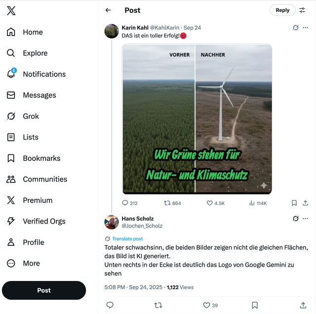 Das Bild zeigt auf der linken Seite einen Wald aus der Vogelperspektive, darüber steht „vorher“. Auf der rechten Seite ist dagegen eine große gerodete Fläche zu sehen und eine Windkraftanlage in der Mitte, darüber steht „nachher“. Unten steht auf dem Bild „Wir Grüne stehen für Natur- und Klimaschutz“. Suggeriert werden soll offenbar, dass Windräder das nicht sind. Unter dem ursprünglichen Beitrag, in dem das angebliche Vorher–Nachher-Bild verbreitet wird, äußern sich mehrere Nutzer kritisch. Ein Kommentar fasst die Kritik zusammen: „Totaler Schwachsinn, die beiden Bilder zeigen nicht die gleichen Flächen, das Bild ist KI generiert. Unten rechts in der Ecke ist deutlich das Logo von Google Gemini zu sehen.“ Das Wasserzeichen rechts unten im Bild entspricht in Form und Stil dem offiziellen Logo von Gemini, einem KI-Assistenten von Google, mit dem sich auch Bilder generieren lassen. Es handelt sich um einen Teil von Googles Kennzeichnungssystem für KI-Inhalte. Neben dem sichtbaren Logo nutzt Google auch ein unsichtbares Verfahren namens SynthID, mit dem Bilder auf Pixelebene markiert werden, ohne dass es für das menschliche Auge erkennbar ist.