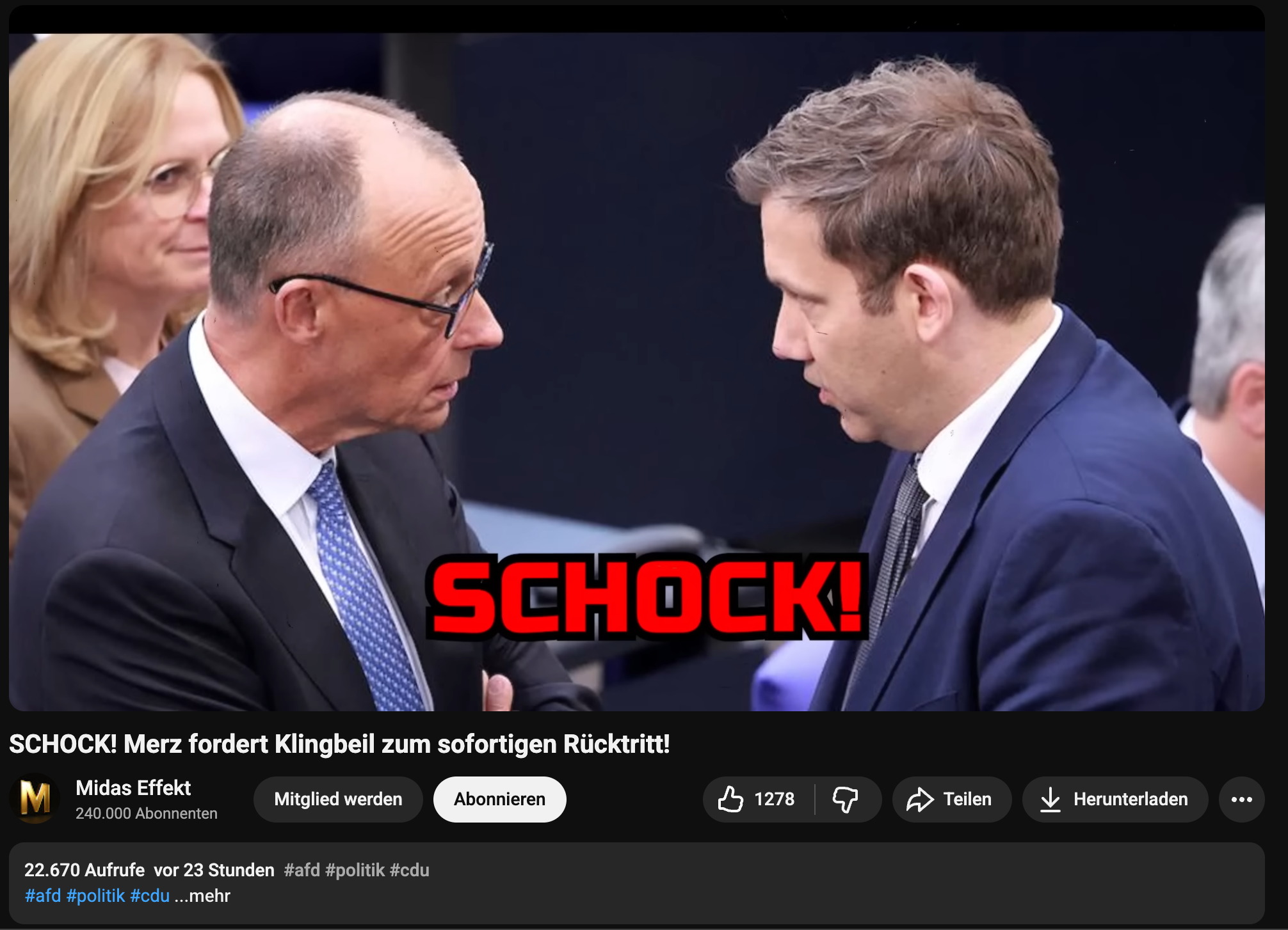 Ein „Schock, wie ihn Berlin seit Jahren nicht erlebt hat“, ein „regelrechter Exekutionsakt“ oder gar eine „präzise inszenierte Demütigung“: Mit solchen Worten behaupten Youtube-Videos, Friedrich Merz habe angeblich den Rücktritt des aktuellen Vizekanzlers und Finanzministers Lars Klingbeil gefordert. Die Videos sind mitunter unterschiedlich formuliert, behaupten aber im Kern dasselbe. Eines der Videos hatte zwischenzeitlich mehr als 20.000 Aufrufe auf Youtube. Der Accountinhaber hat es inzwischen nur noch für Mitglieder seines Kanals freigegeben, eine Mitgliedschaft kostet 200 Euro im Monat.